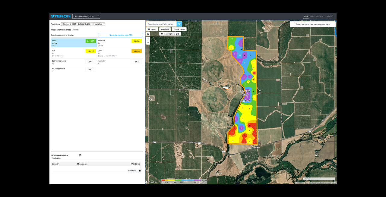 Stenon предоставляет полностью интегрированную систему управления данными о почве, адаптированную к уникальным требованиям Калифорнии. Благодаря сочетанию современного оборудования, искусственного интеллекта и интуитивно понятного программного обеспечения наши решения предоставляют практические рекомендации для ключевых культур региона, таких как овощи, фрукты и многолетние насаждения. Анализ данных в реальном времени по таким параметрам, как Nmin, SOC, содержание глины и влажность, позволяет принимать обоснованные решения, оптимизировать фертигацию и улучшать устойчивость в аграрных процессах.